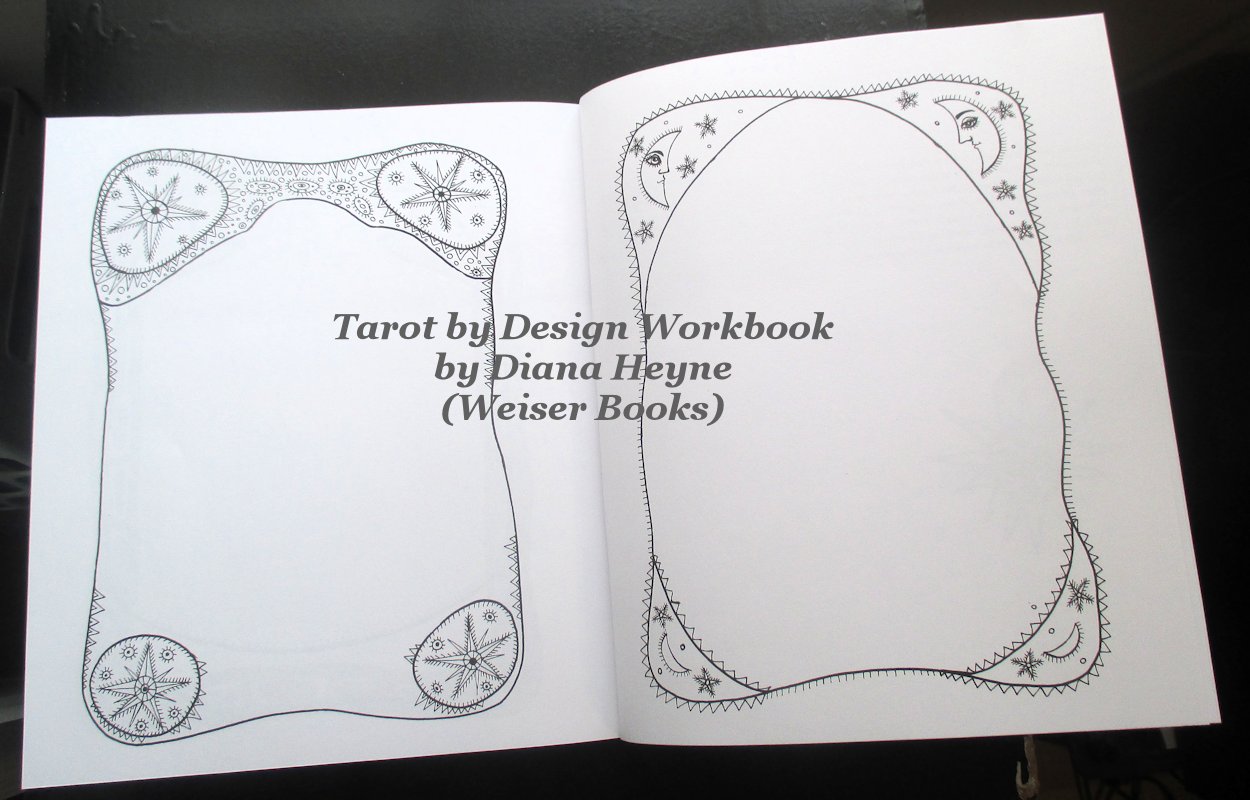 The Tarot by Design Workbook is a perfect-bound paperback book featuring original color-in images of the 22 major arcana cards, along with the 56 images of the minor arcana. Each card also gets a “Learning Page” containing keywords for upright and reversed cards, with space for Notes. Learning Pages for the major arcana cards also contain a rhyme or phrase related to the card. At the back are blank pages framed creatively for the reader’s own artwork.